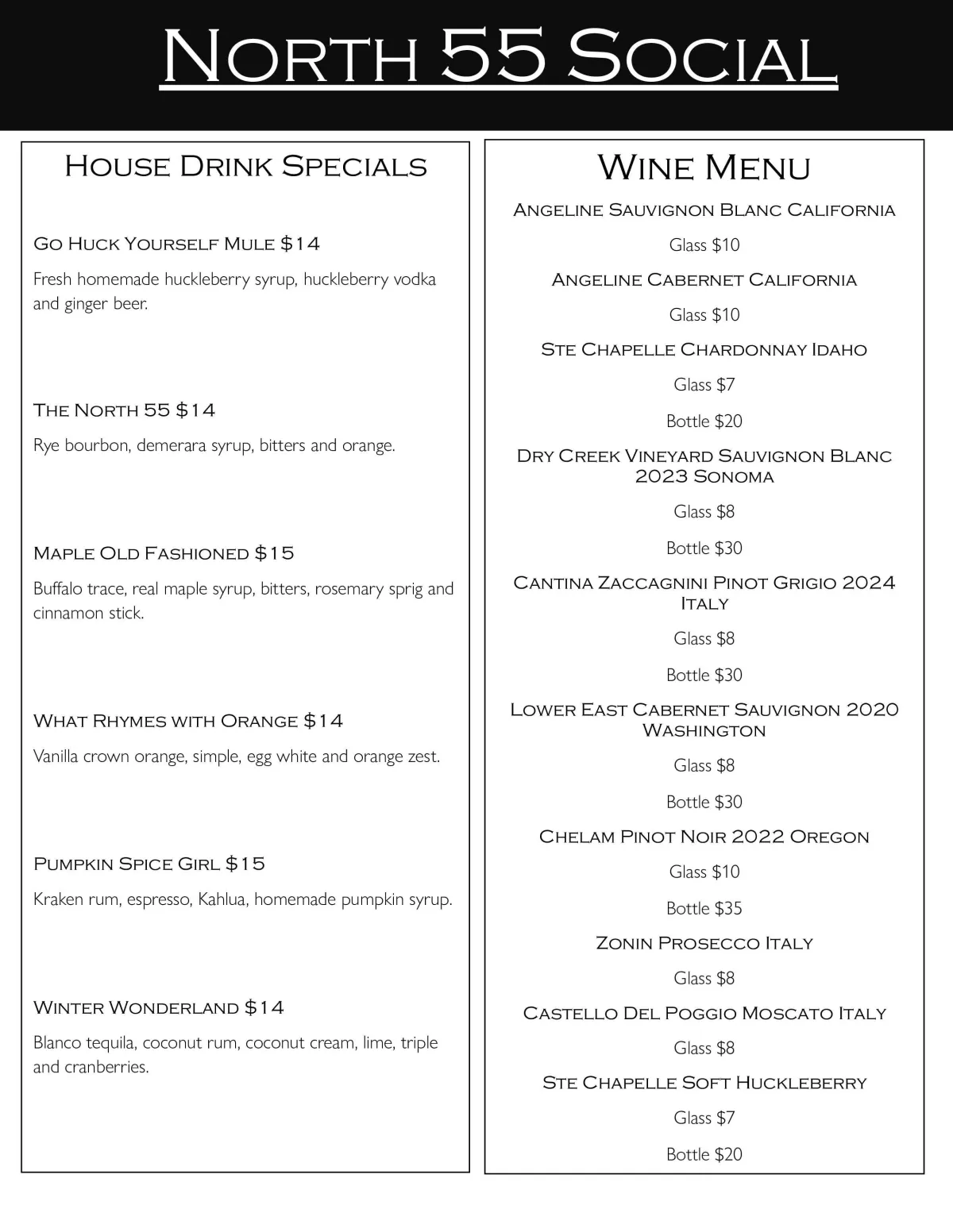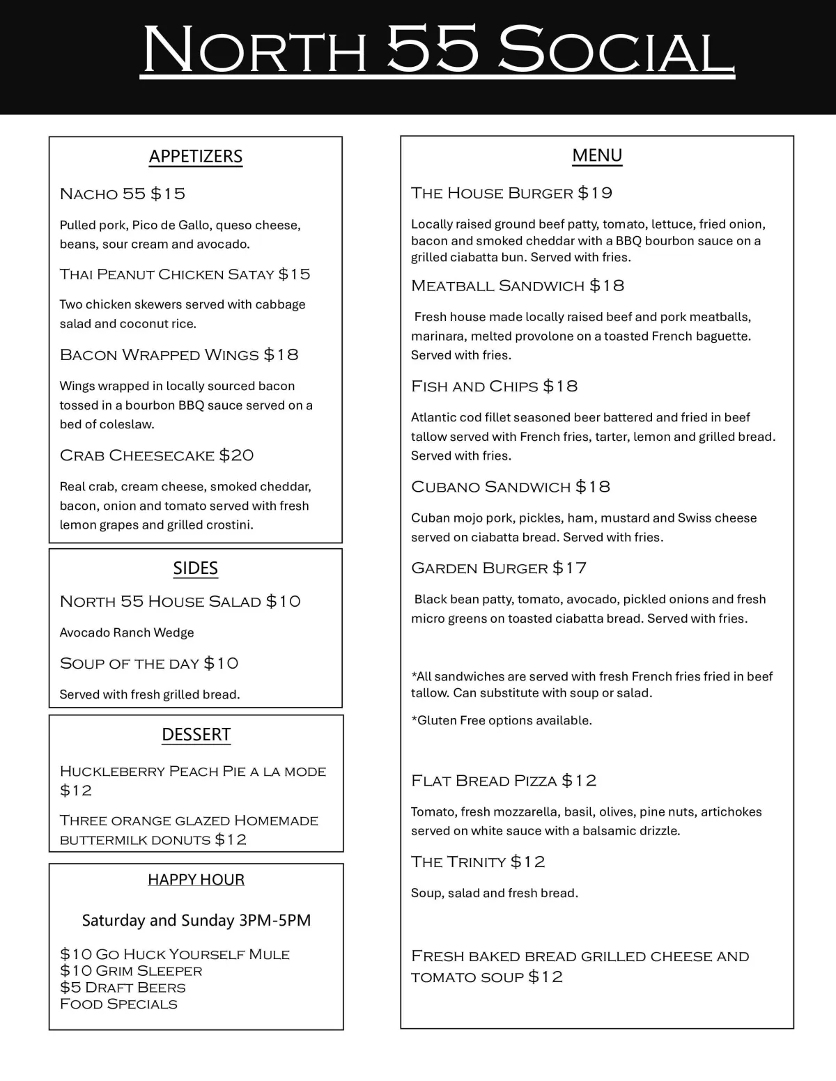 Welcome to North 55 Social, where elevated comfort food meets local flavor. Our fall menu features handcrafted dishes made with fresh, locally sourced ingredients—from our signature House Burger and bourbon-glazed bacon wings to flavorful flatbreads and seasonal soups. With gluten-free options and indulgent house-made desserts, every dish is crafted for comfort and connection. Whether you’re here for a casual bite or a special night out, North 55 Social delivers bold flavors and a warm, welcoming experience.
